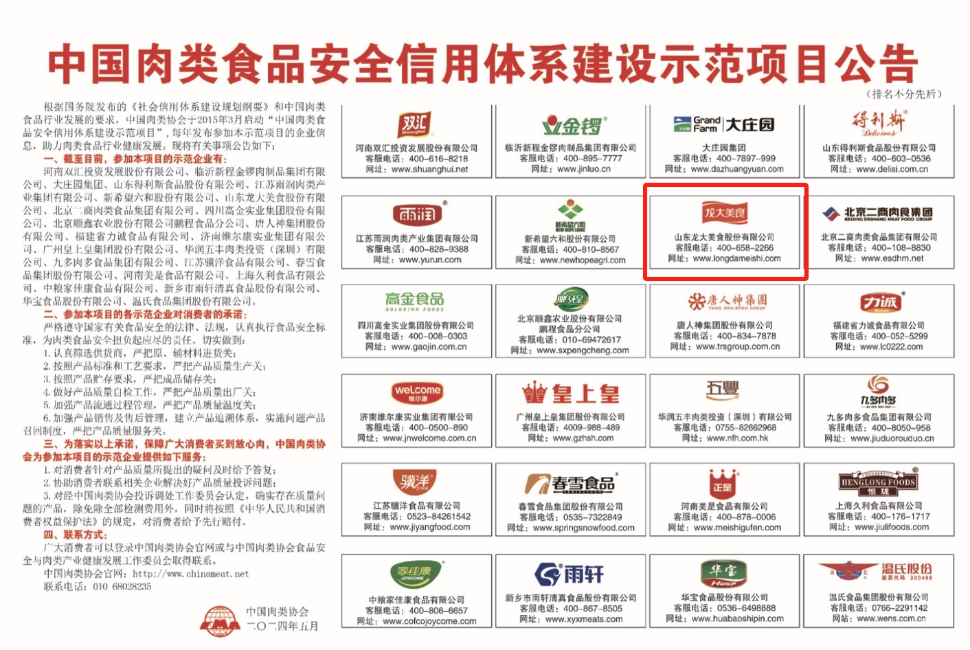 2015Ä꣬ÖйúÈâÀàÐ»áÆ¾Ö¤¹úÎñÔºÐû²¼µÄ¡¶Éç»áÐÅÓÃϵͳ½¨ÉèÍýÏë¸ÙÒª¡·ºÍÖйúÈâÀàʳÎïÐÐÒµÉú³¤µÄÒªÇ󣬯ô¶¯ÁË¡°ÖйúÈâÀàʳÎïÇå¾²ÐÅÓÃϵͳ½¨ÉèÊ÷Ä£ÏîÄ¿¡±£¬ÒÔºóÿÄêÐû²¼¼ÓÈë¸ÃÊ÷Ä£ÏîÄ¿µÄÆóÒµÐÅÏ¢£¬ÖúÁ¦ÈâÀàʳÎïÐÐÒµ¿µ½¡Éú³¤¡£ÈëÑ¡¸ÃÏîÄ¿µÄ¸÷Ê÷Ä£ÆóÒµÐèÑÏ¿á×ñÊØ¹ú¼ÒÓйØÊ³ÎïÇå¾²µÄÖ´·¨¡¢¹æÔò£¬ÈÏÕæÖ´ÐÐʳÎïÇå¾²±ê×¼£¬ÎªÈâÀàʳÎïÇå¾²µ£¸ºÆðÓ¦¾¡µÄÔðÈΡ£